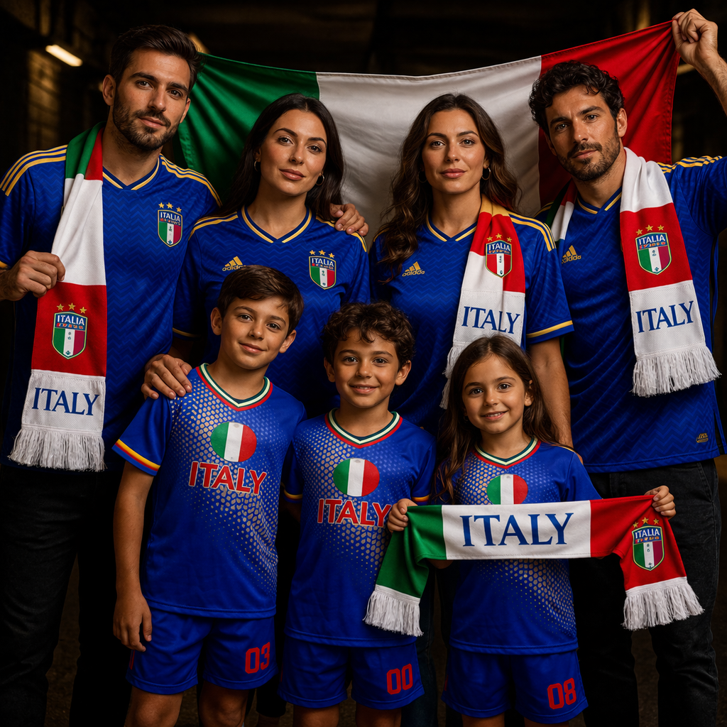 Este kit tribo captura a essência da Seleção Italiana para famílias grandes ou grupos de amigos. Vistam as camisolas, enrolem os cachecóis, ponham os equipamentos nos mais pequenos e hasteiem a bandeira juntos – sintam que estão unidos como uma verdadeira tribo de torcedores. No estádio em multidão, no churrasco a vibrar ou em casa a torcer pelo próximo golo histórico. Porque apoiar Itália não é só cultura… é uma emoção coletiva que une o pessoal todo e dura para sempre.